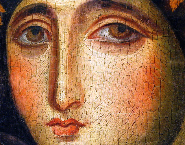 (b) No se aprecia o no es perceptible -por observación directa- la presencia de craquelado en la capa protectora de la pintura, muy propio de los cuadros pintados al óleo y producto del envejecimiento natural. No obstante, al ampliar la visión, en el rostro de la Virgen, y probablemente originado por la composición de la pintura empleada para obtener el blanco tez, se observa un profuso micro craquelado o cuarteado de la superficie de la pintura.